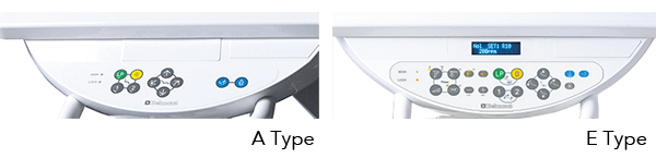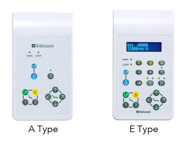 A2(control of air instruments, water on/off and chip air) for A type. SE(control of air instruments, water on/off, chip air and control of electric motor/scaler) for E type. Foot controller with handle is available as an option.