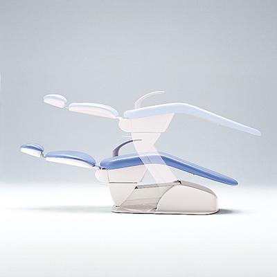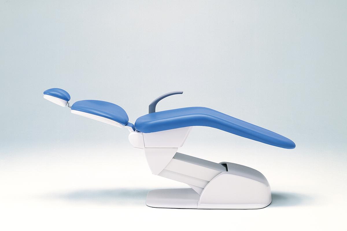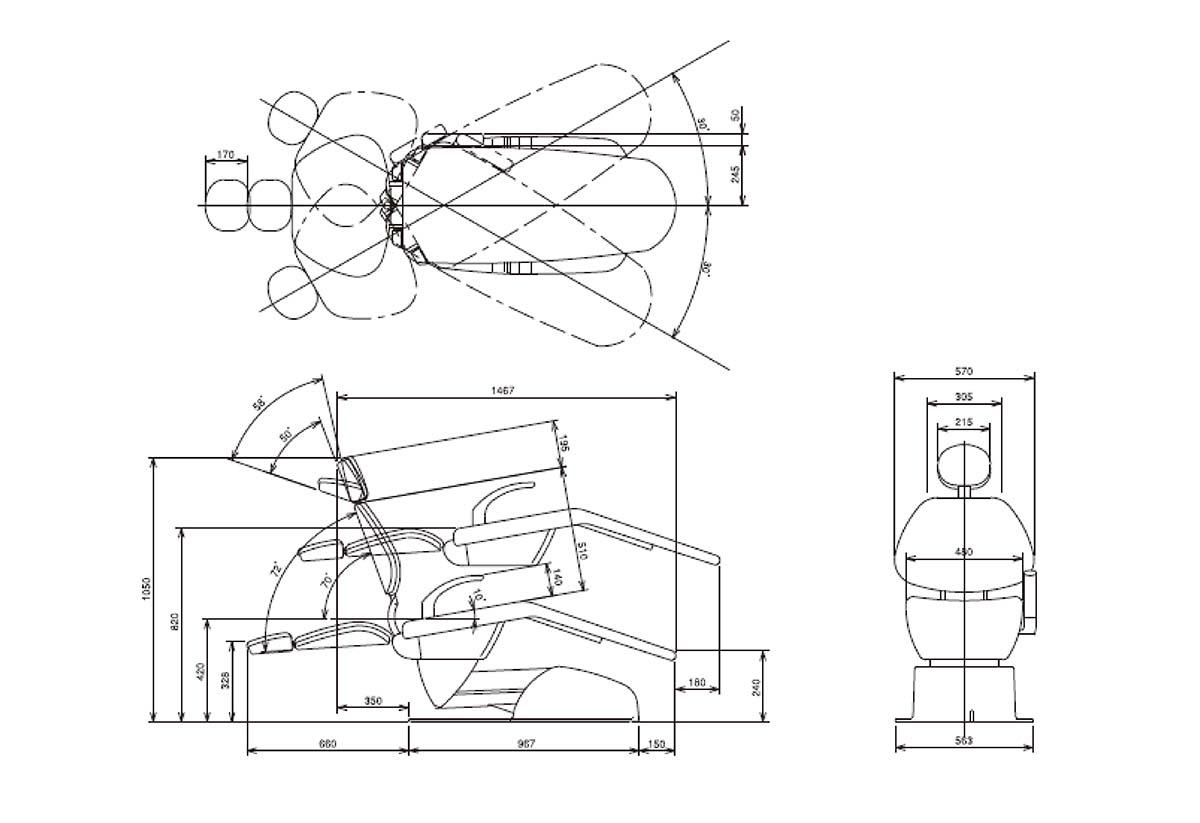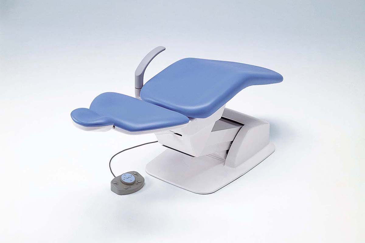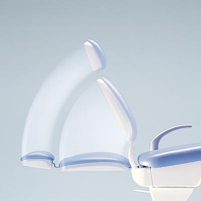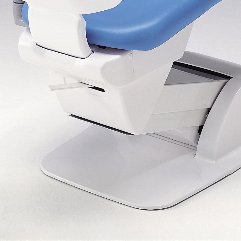 The design and movement of the backrest mechanism simulates the natural body movement of the patient. Simple chair rotation (optional) facilitates X-Ray examinations. Rotation (60 degrees) is locked and released by a lever.